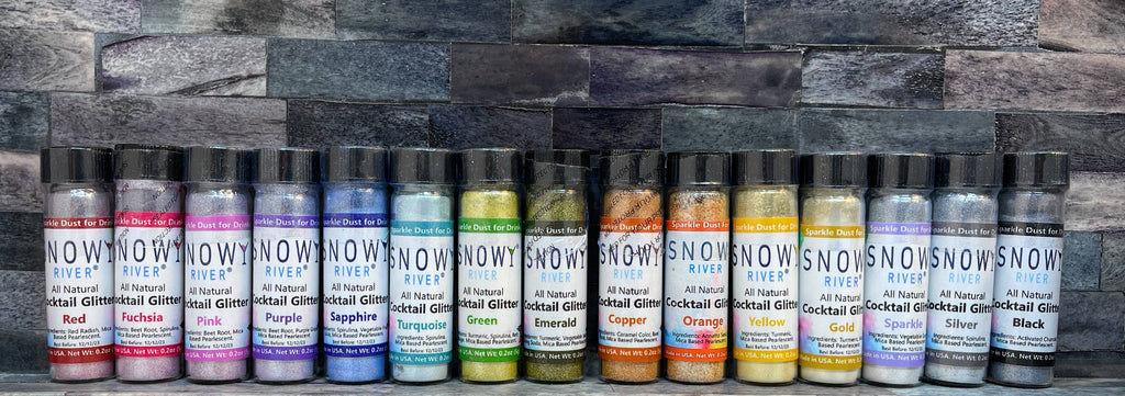 Snowy River All Natural Cocktail Glitter Snowy River cocktail glitter brings an amazing sparkle and shine to your cocktails! Colored with all natural fruit and veg, our cocktail glitters and are designed to be very lightly dusted on to the top of cocktails or stir in a smidgen to add amazing color and sparkle. Importantly, Snowy River cocktail glitters contain no preservatives, are fully water soluble, and look amazing in vodka, tequila and other clear based cocktails. To make your cocktails look truly amazing, rim the edge of the cocktail glass with Snowy River natural cocktail sugar and then add cocktail glitter or even a Snowy River cocktail topper as the final exquisite touch. You can create your own natural food coloring using Snowy River cocktail glitter by simply mixing Snowy River cocktail glitter with water or oil to make the desired color. Alternatively blend with simple syrup to create your own fun range of colored syrups to use in your drinks.