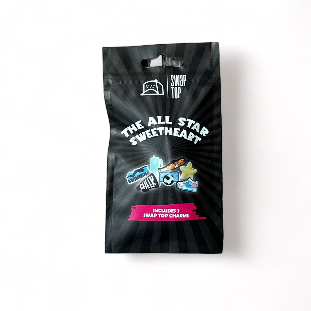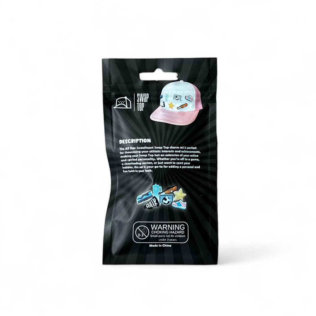 The All-Star Sweetheart charm set comes with a 'swimming' charm, turquoise tumbler,  soccer goal, pink tennis shoe, 'Cheer' megaphone, gold star, and a softball bat. The All-Star Sweetheart charm set is perfect for showcasing your athletic interests and achievements, making your Swap Top hat an extension of your active and spirited personality. Whether you're off to a game, a cheerleading session, or just want to sport your hobbies, this set is your go-to for adding a personal and fun twist to your look.