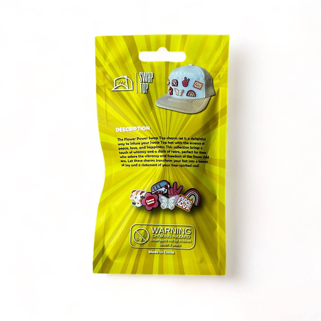 The Flower Power charm set comes with woodland mushrooms, a vintage van, a pink peace sign, 'peace love', 'flower power', a pink butterfly, and a pastel rainbow charm. The Flower Power charm set is a delightful way to infuse your Swap Top hat with the essence of peace, love, and happiness. This collection brings a touch of whimsy and a dash of retro, perfect for those who adore the vibrancy and freedom of the flower-child era. Let these charms transform your hat into a beacon of joy and a statement of your free-spirited soul!
