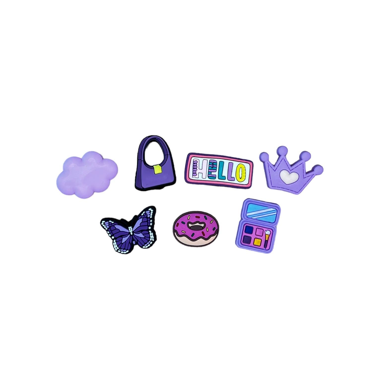 The Lavender Craze charm set includes a purple cloud, purse, 'Hello' charm, crown with a heart, purple butterfly, a donut makeup charms.