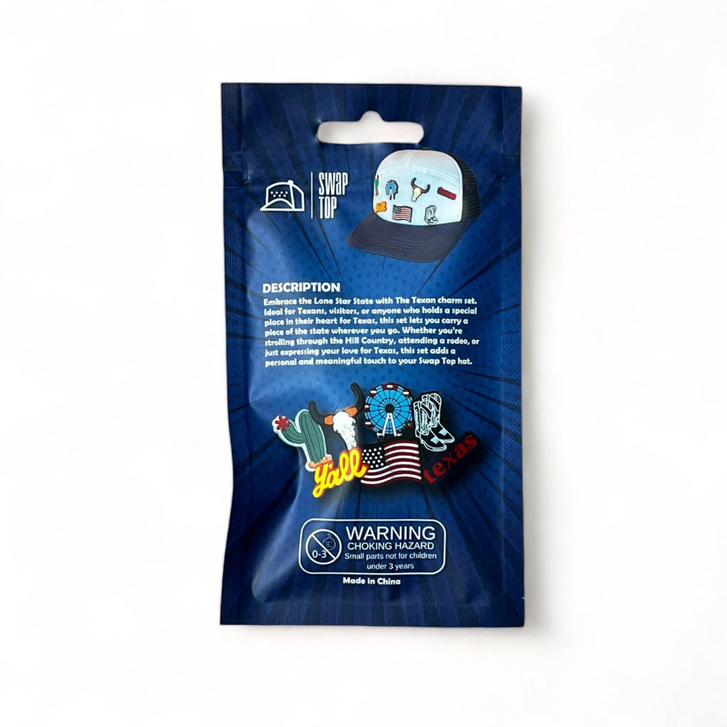 Embrace the Lone Star State with The Texan charm set. Ideal for Texans, visitors, or anyone who holds a special place in their heart for Texas, this set lets you carry a piece of the state wherever you go. Whether you're strolling through the Hill Country, attending a rodeo, or just expressing your love for Texas, this set adds a personal and meaningful touch to your Swap Top hat.
